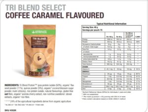 Tri-Blend Select Coffee Caramel Flavoured Original is a deliciously creamy protein shake offering you naturally sourced ingredients and great taste. With a unique combination of ingredients, Tri-Blend Select is also high in fibre and low in sugar. We have carefully selected Pea, Quinoa and organic Flax Seed as part of a vegan blend to deliver a protein source providing essential amino acids, vitamin C and 7 key minerals from natural sources.